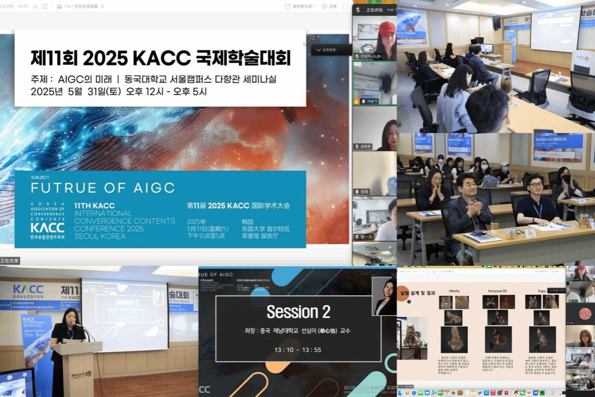 2025年5月31日,第11届KACC国际学术大会在韩国首尔召开。本届大会以“AIGC的未来”(Future of AIGC)为主题,聚焦全球人工智能生成内容的技术演进与跨学科应用,围绕AIGC技术现状、伦理挑战及设计应用场景展开深度研讨。澳门网投官方网站青年教师单心怡参加并主持专题研讨会议。