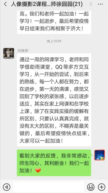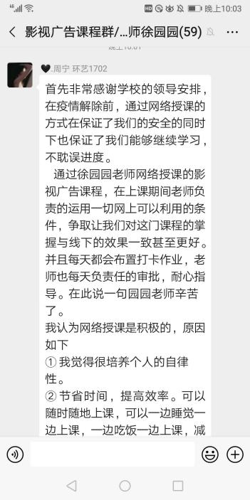 丁奕翔老师:目前所开课程为大一专业基础课。根据专业特点,在授课群的基础上,另外建立了国画、油画、综绘三个不同的专业方向群,使学生的讨论更有针对性,效果更佳。另外,认真总结第一周的教学状况,并提出第二周的改进内容,为保证线上教学质量做好保障。