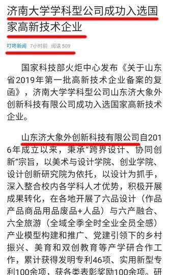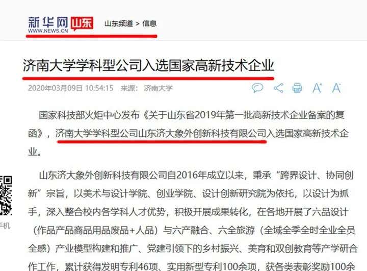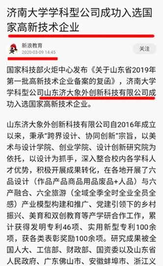 新华网、新浪网、齐鲁壹点、叮咚FM等多家媒体报道:学科型公司山东济大象外创新科技有限公司顺利通过国家高新技术企业认定。这家专门做设计的企业是澳门网投官方网站的一个科研成果转化平台,2016年刚刚成立,很多设计力量其实就是澳门网投官方网站澳门网投官方网站的师生。