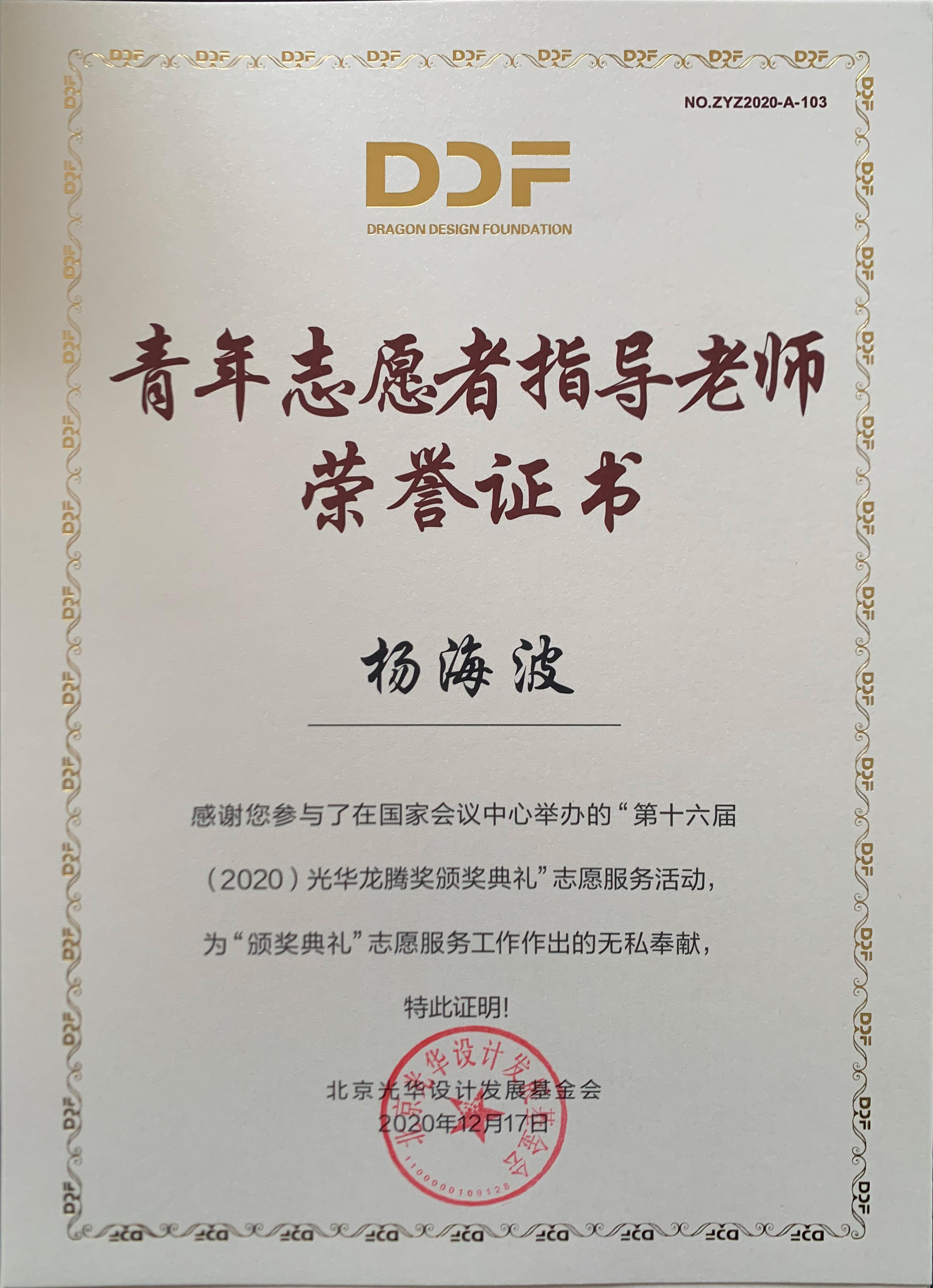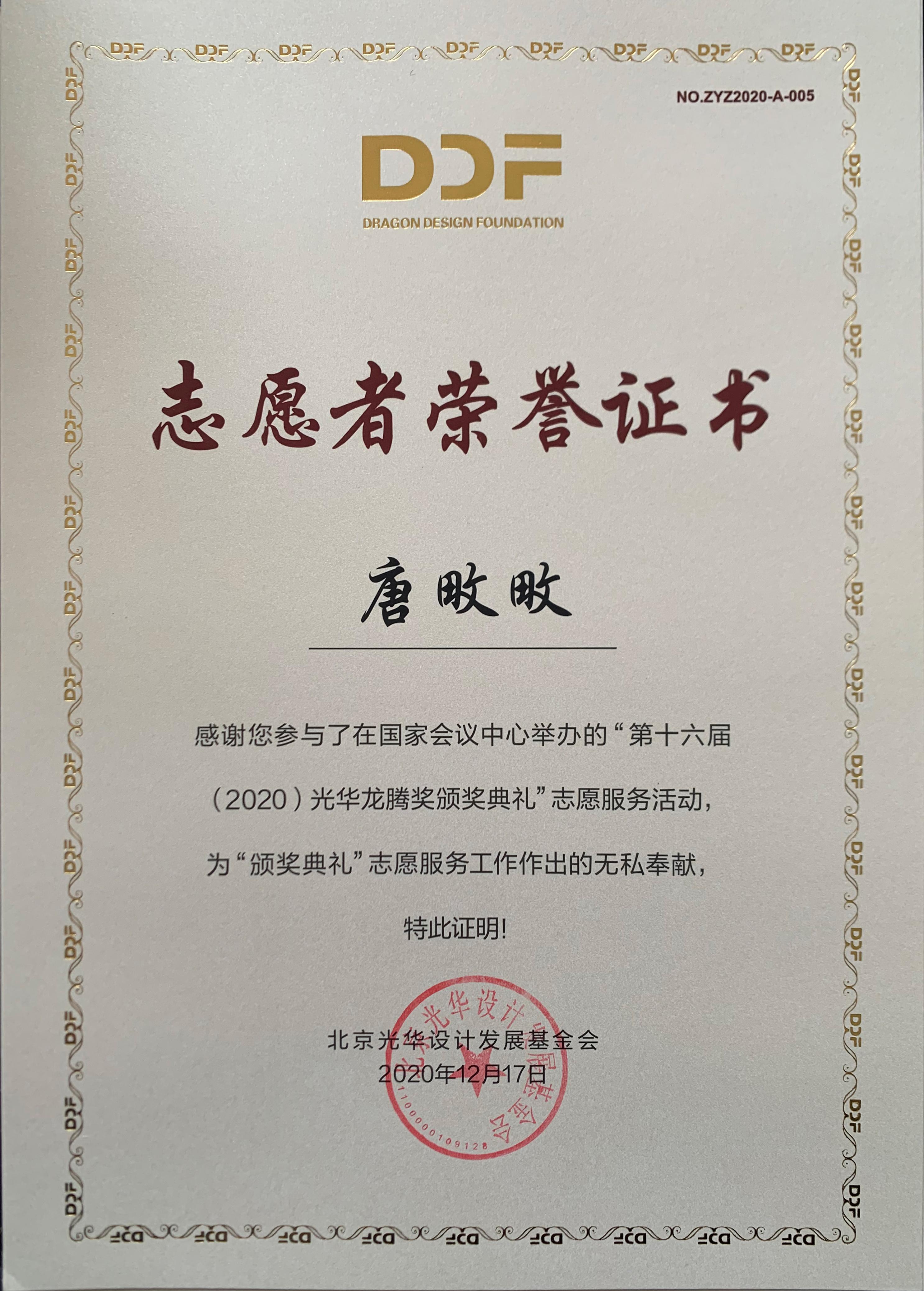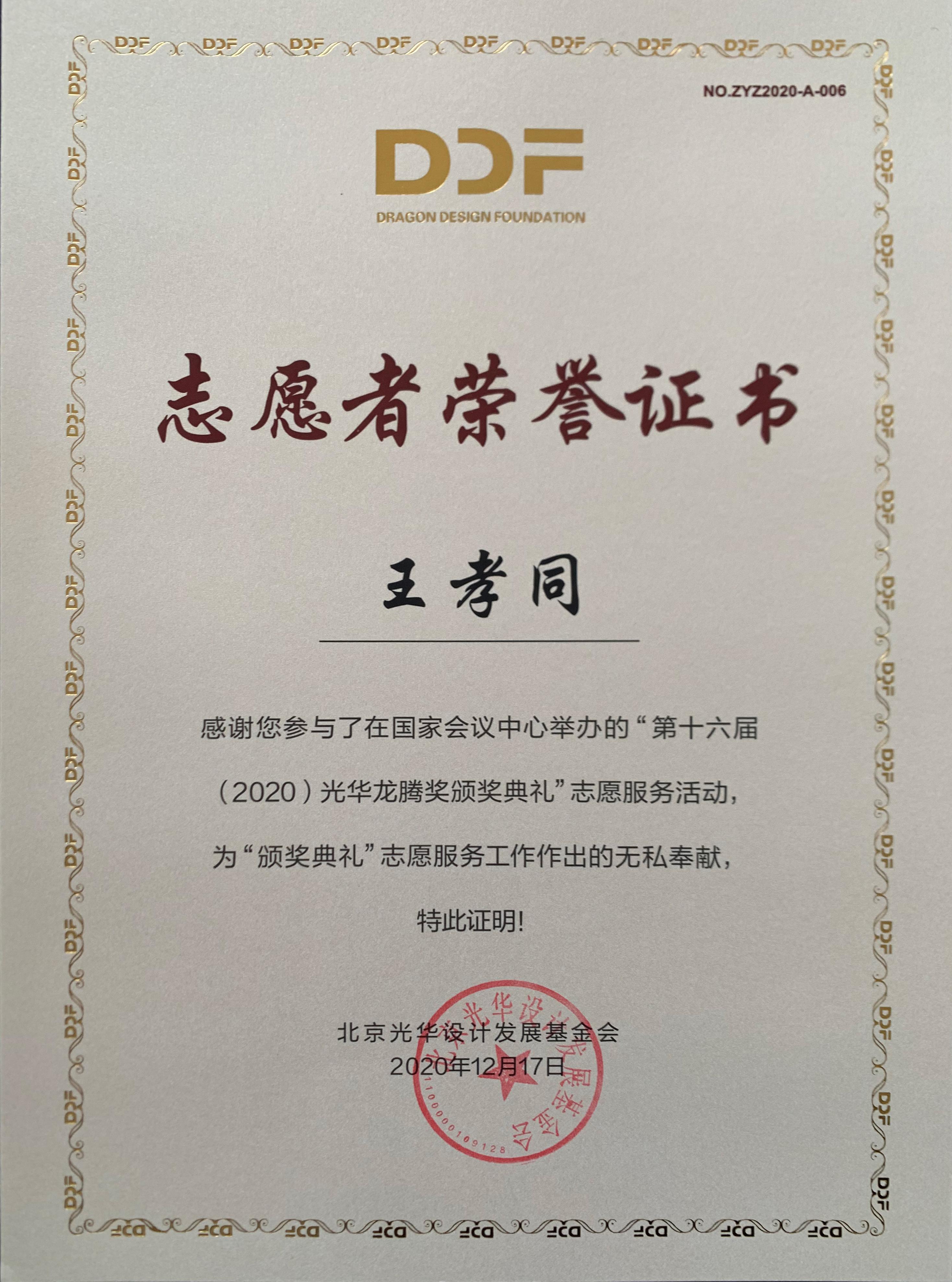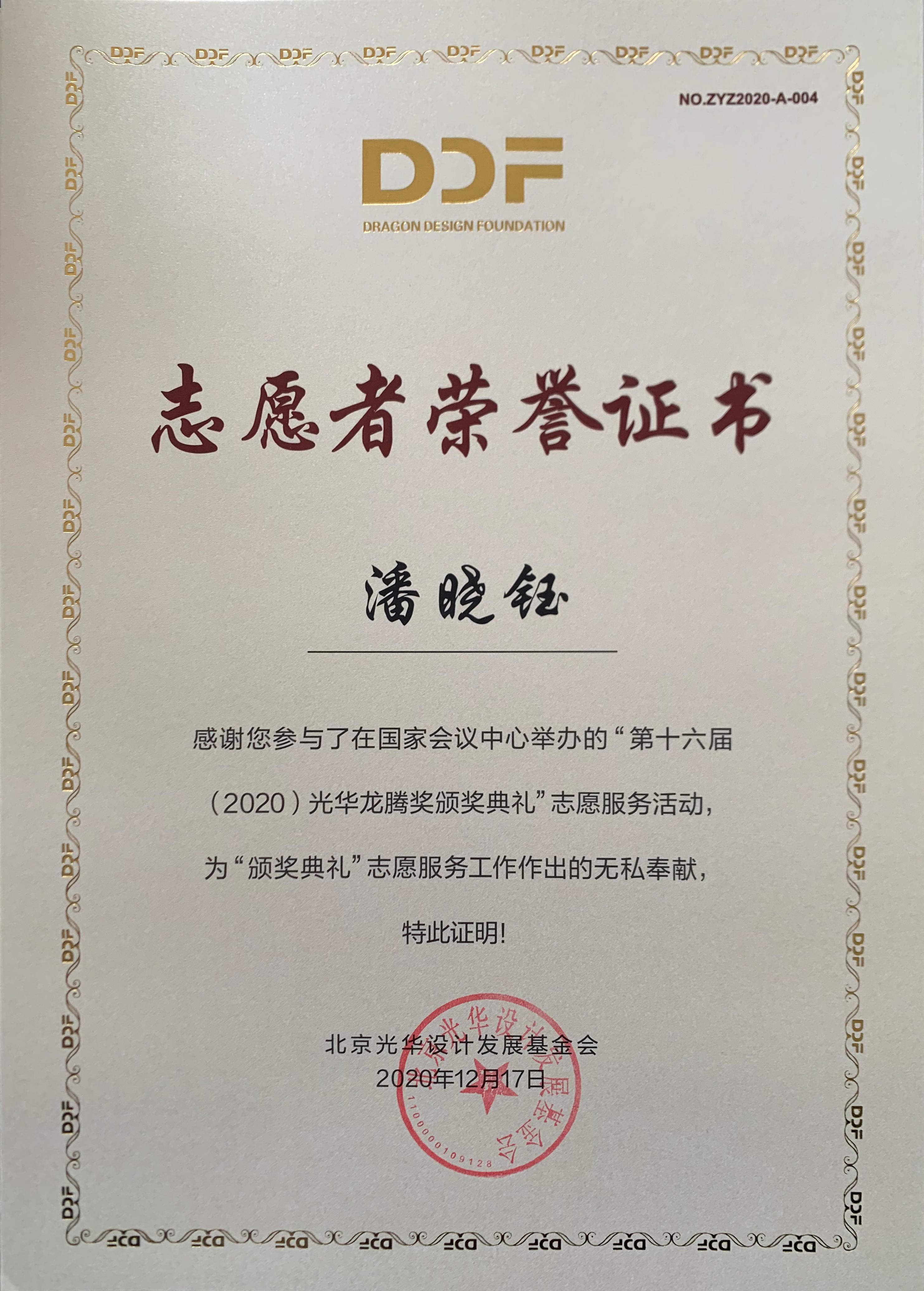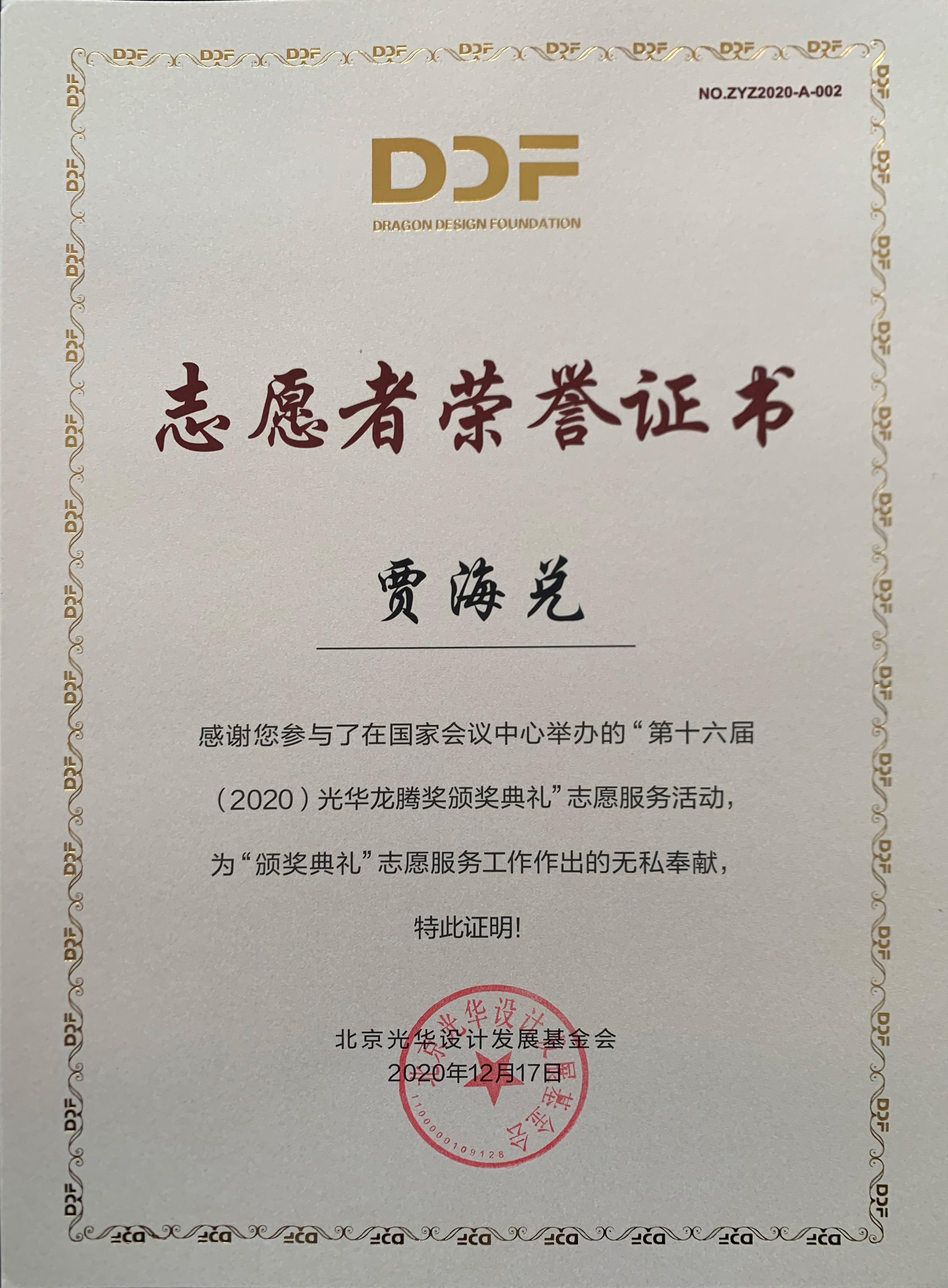 2020年12月17日上午,第十六届(2020)光华龙腾奖颁奖典礼在国家会议中心隆重举行。澳门网投官方网站澳门网投官方网站荣誉院长柳冠中被授予“光华龙腾奖委员会荣誉主席”称号。澳门网投官方网站杨海波老师指导的“光华-澳门网投官方网站志愿服务队”为北京光华设计发展基金会相关活动作了大量设计志愿服务工作,得到组委会高度肯定并获颁志愿者荣誉证书。