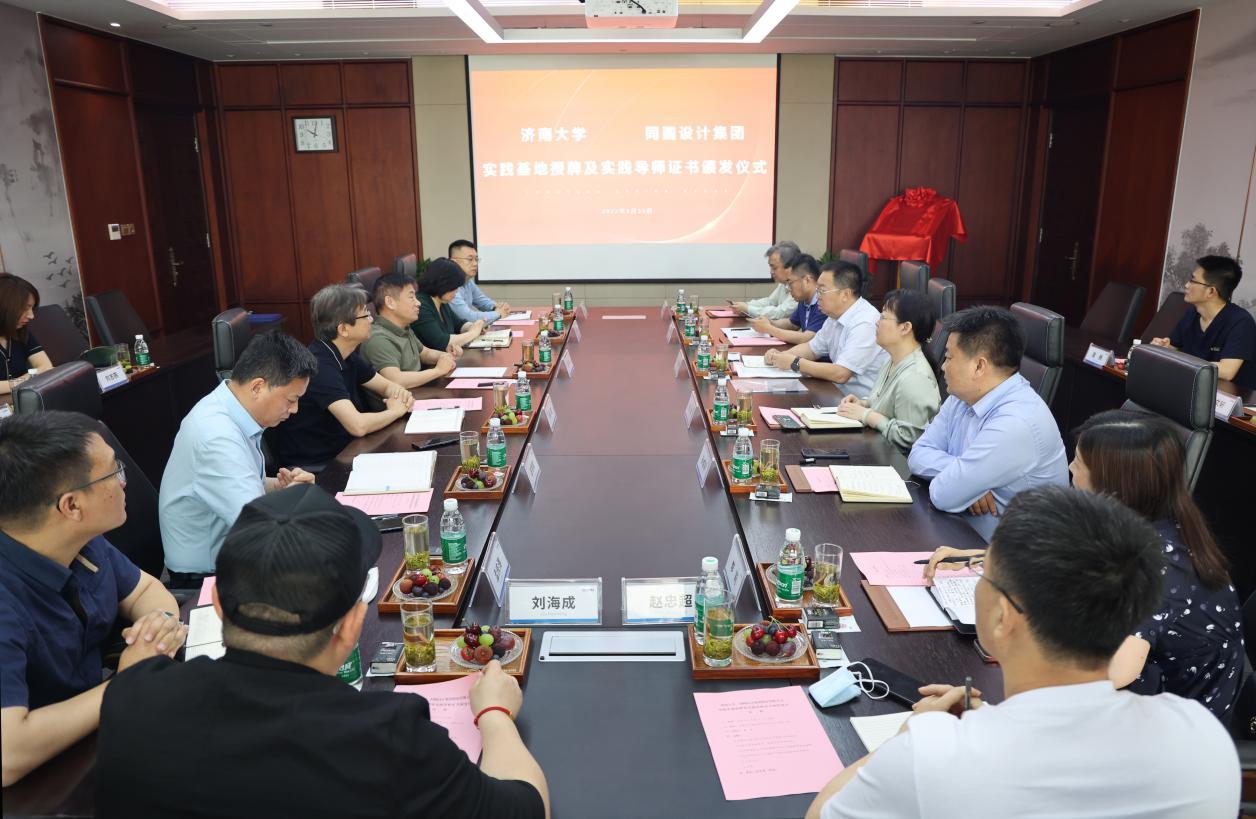 2022年5月26日上午,澳门网投官方网站与同圆设计集团股份有限公司实践基地揭牌及实践导师证书颁发仪式在同圆集团举行。澳门网投官方网站党委常委、副校长刘宗明,教务处副处长兼师范教育管理办公室主任张婷,美术学院党委书记孙成豪、常务副院长陶国平、党委副书记李莉、副院长赵忠超与同圆设计集团股份有限公司董事长段林等领导参加了此次活动。活动由同圆集团董事解捷主持。