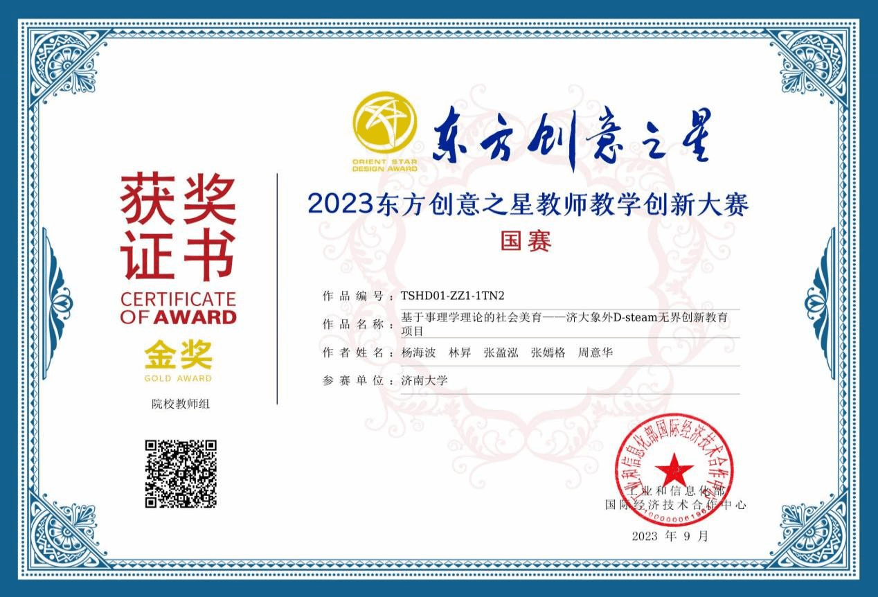 近日,第四届东方创意之星教师教学创新大赛国赛评审会在江苏大学举办,澳门网投官方网站杨海波中华美育无界创新教研团队经过激烈角逐,从全国1502个参赛队伍中脱颖而出,荣获金奖。