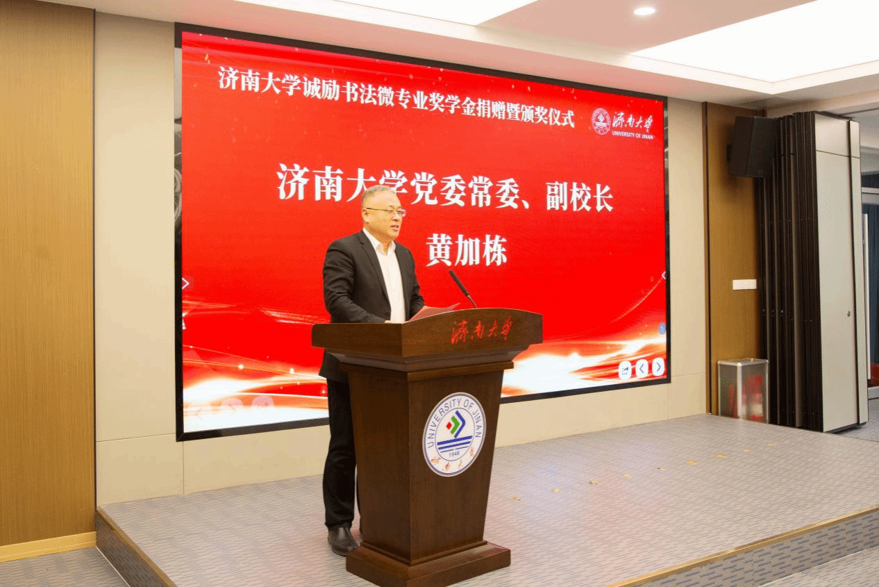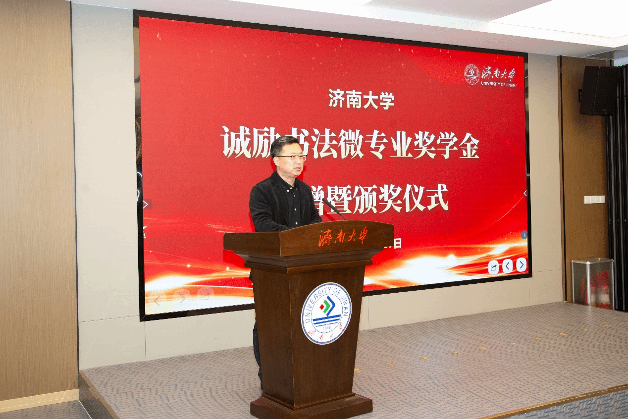 12月27日,澳门网投官方网站“诚励书法微专业奖学金”捐赠暨颁奖仪式在第五报告厅举行。澳门网投官方网站党委常委、副校长黄加栋,山东诚励教育科技有限公司董事长梁成立出席。诚励教育科技执行校长张涛、财务总监王倩倩,澳门网投官方网站党委学生工作部(处)副部(处)长董俊杰,教务处副处长张海鹍,合作发展处副处长、教育发展基金会办公室副主任景丽萍、校团委相关负责人,澳门网投官方网站党委书记陈春锋,党委副书记副院长何贵亮以及师生代表参加了活动。活动仪式由澳门网投官方网站副院长杨海波主持。