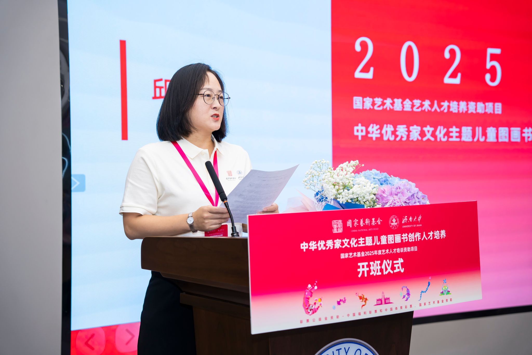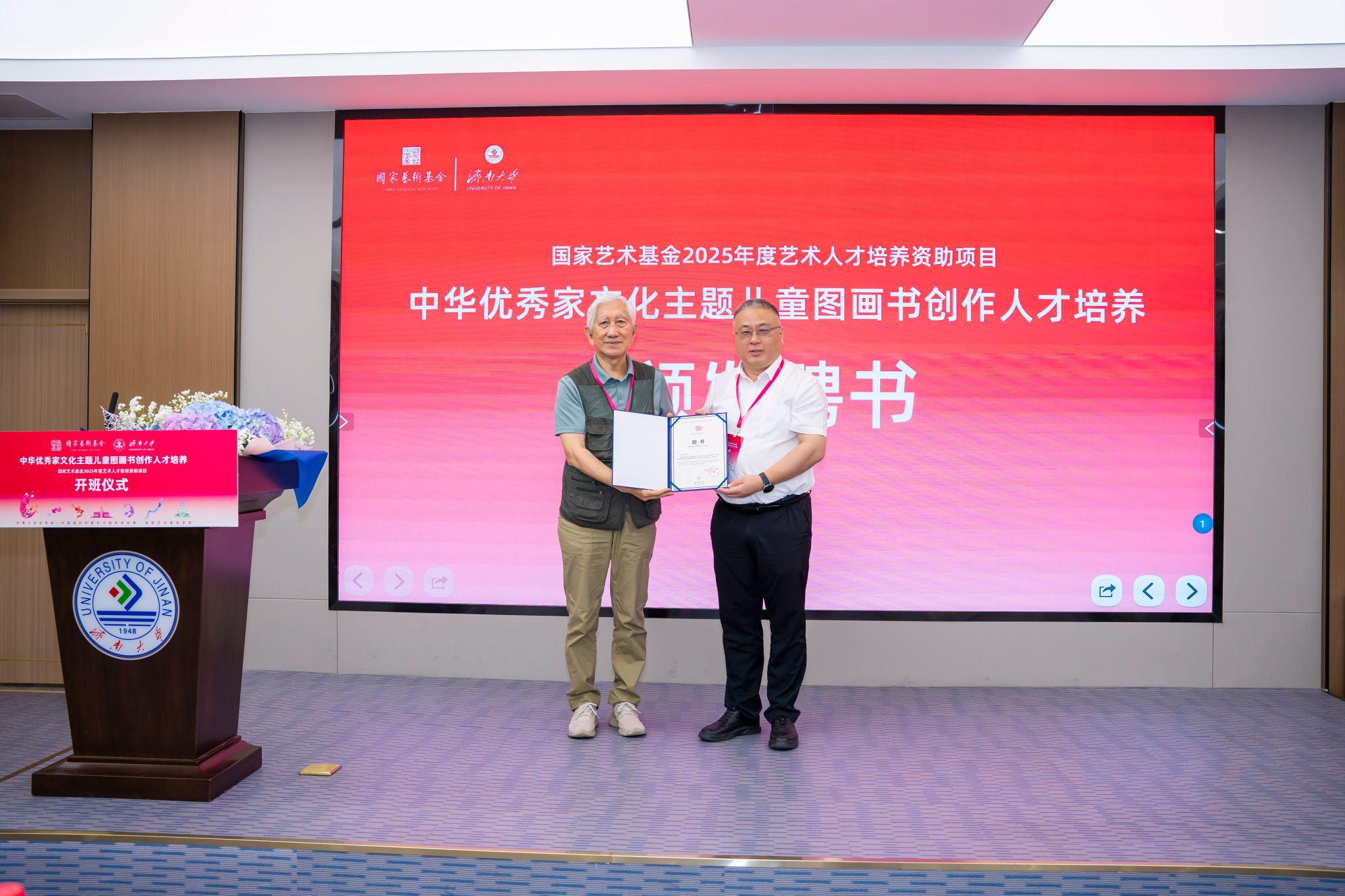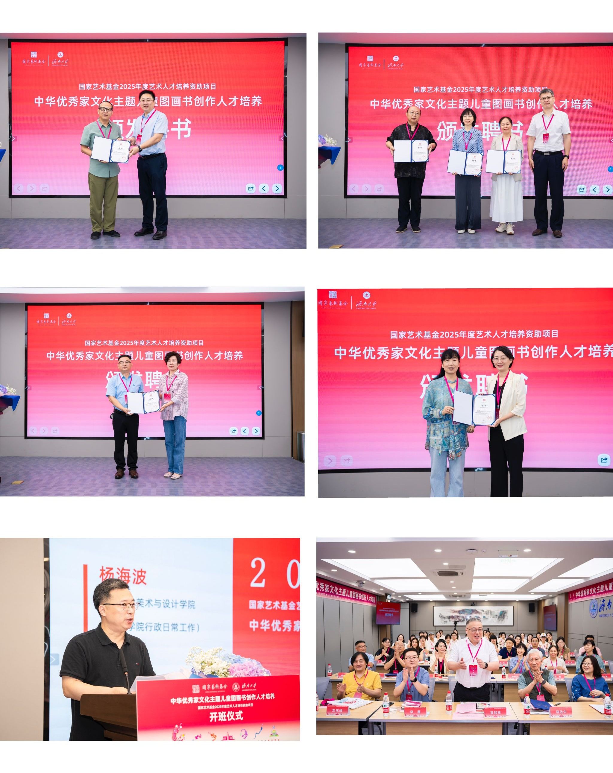 7月1日,国家艺术基金2025年度艺术人才培养资助项目“中华优秀家文化主题儿童图画书创作人才培养”开班仪式在澳门网投官方网站隆重举行。清华大学首批文科资深教授柳冠中,山东省艺术研究院专职副书记、国家艺术基金山东项目管理办公室主任李磊,山东省文艺评论家协会副主席、秘书长王之明,山东师范大学赫尔岑国际艺术学院院长刘东峰,山东工艺美术学院教务处处长顾群业。澳门网投官方网站党委常委、副校长黄加栋,党委常委、宣传部部长卢旺,社科处、合作发展处、澳门网投官方网站相关负责人,项目教师授课代表及项目学员们参加本次仪式。开班仪式由澳门网投官方网站澳门网投官方网站副院长杨海波主持。